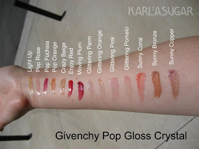 Givenchy Pop Gloss Crystal: Light Up, Pop Rose, Pop Fuchsia, Pop Orange, Crazy Beige, Enjoy Red, Moving Plum, Glittering Parm, Glittering Orange, Glittering Pink, Glittering Pomelo, Sunny Coral, Sunny Bronze, Sunny Copper