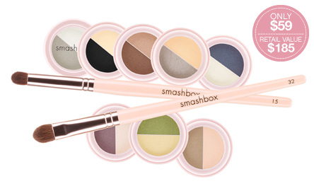 As you know, I’m a fan of Smashbox’s eyeshadow singles (and I’ve got swatches to prove it) — and Smashbox brushes have quite a following — so I was most interested in the Rapture eyeshadow set. $59 gets you 8 eyeshadow duos and two brushes: #15 and #32 (crease and blending brushes).
