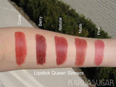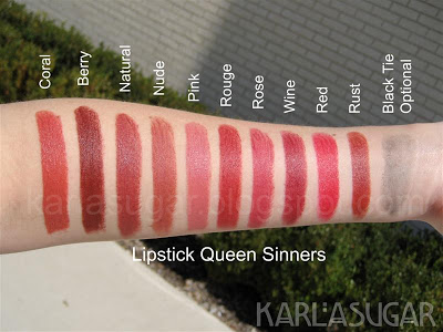 Lipstick Queen Sinner Lipstick: Coral Sinner, Berry Sinner, Natural Sinner, Nude Sinner, Pink Sinner, Rouge Sinner, Rose Sinner, Wine Sinner, Red Sinner, Rust Sinner, Medieval, Black Tie Optional