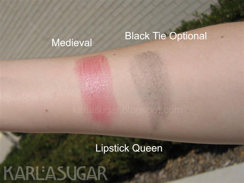 About the bonus two lipsticks… Black Tie Optional lipstick was sitting on the Saints and Sinners display unit, and since it comes in the same color tube as the Sinner lipsticks, I thought it was one of them. It’s not. Black Tie Optional is a mattifying black lipstick, meant to be worn on top of something else to make it extra sexy (kind of like Lancome’s Piha gloss).